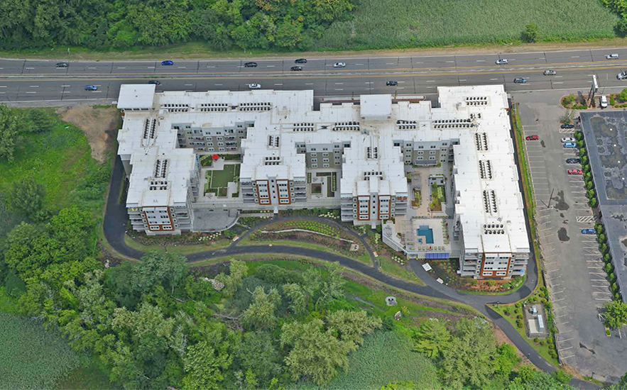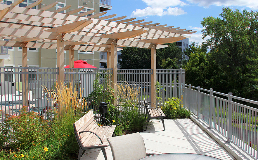 Pedestrian and bicycle paths connect to the nearby MBTA Alewife Station and the Alewife Brook Reservation’s open space network. The open space planting is comprised of native and adapted species within rain gardens. This project has achieved Silver certification under the LEED Multi-Family Mid-Rise Home Rating System.