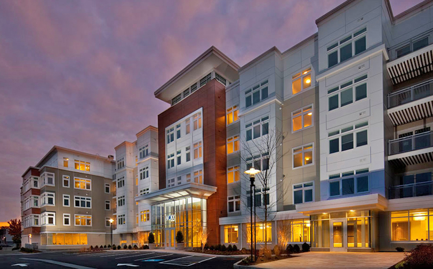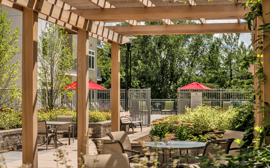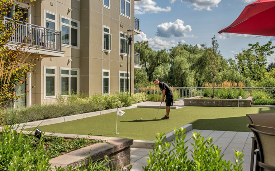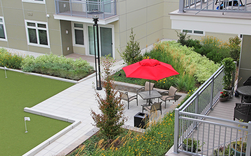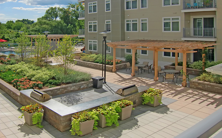 Shadley Associates worked with CUBE 3 Studio on VOX on Two, a 228 unit luxury apartment building located on a four acre site on Route 2 in Cambridge, Massachusetts.  For this project, Shadley Associates designed an entry motor court with visitor parking, a pedestrian plaza to provide a sense of arrival, and a series of elevated courtyards above structured parking.  The courtyards feature a swimming pool, gardens with arbors, grilling stations and a mini-putt golf course.